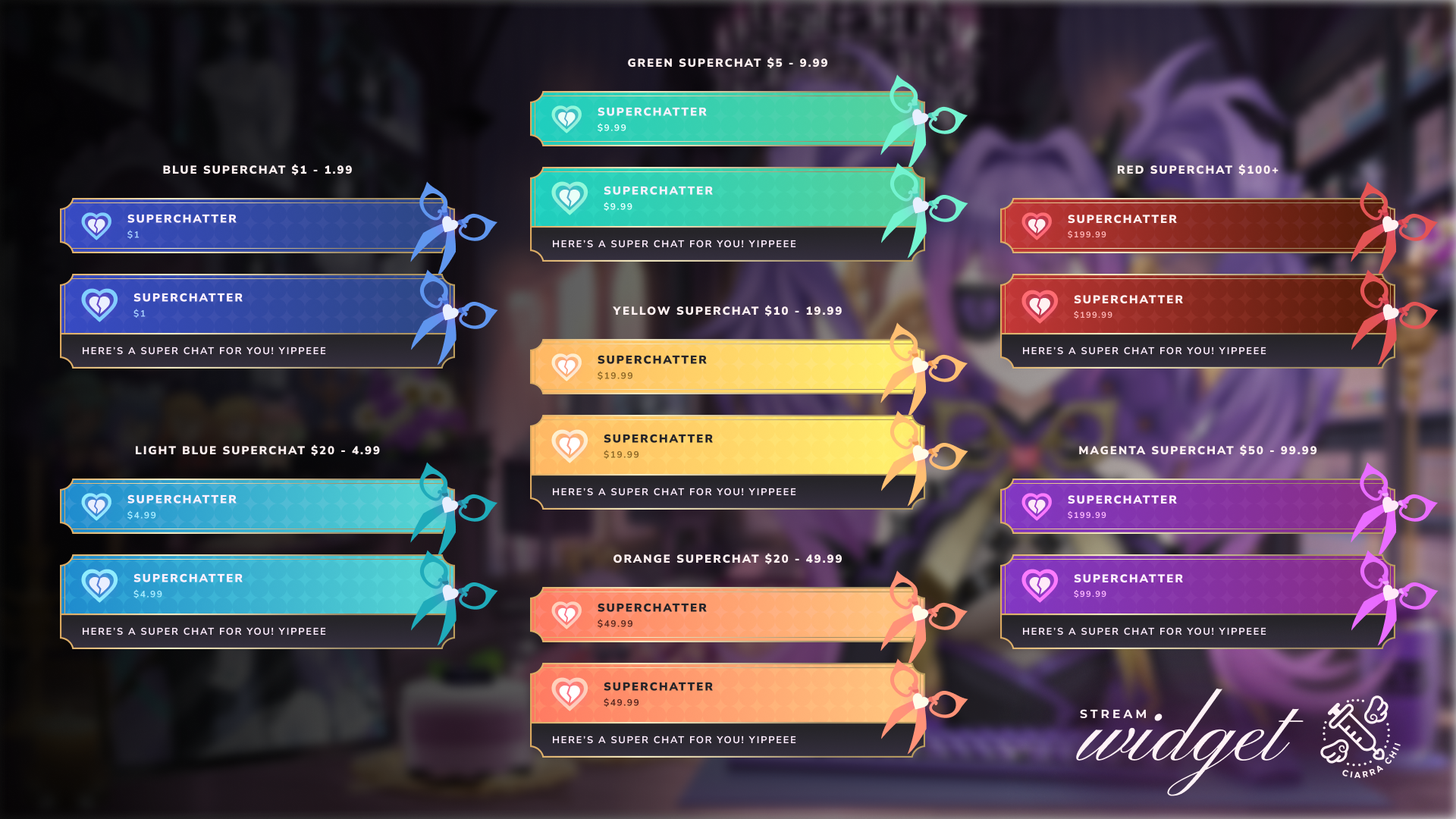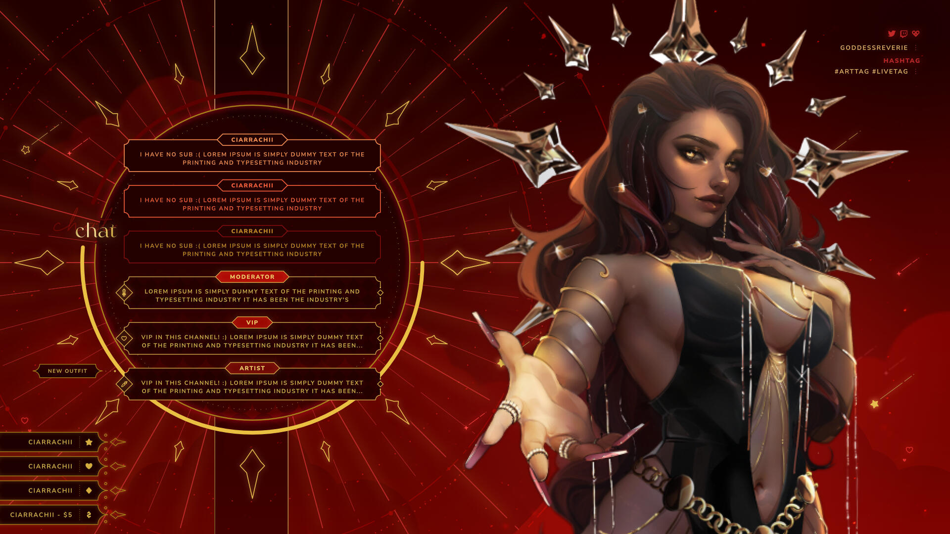 Custom widget designs. Here are some graphics that I provide. Please note that I only provide the design. The client shall be responsible to look for a coder.If you want to insert any artwork, badges or emotes on your widget, please let me know beforehand.