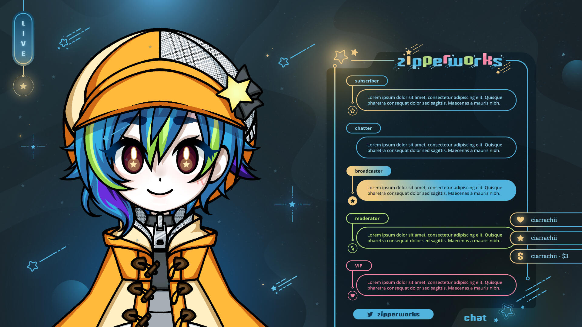 I'm Ciarra Chii. I create vtuber models, live2d rigging, and visual designs for Content Creators, Vtubers and Streamers.